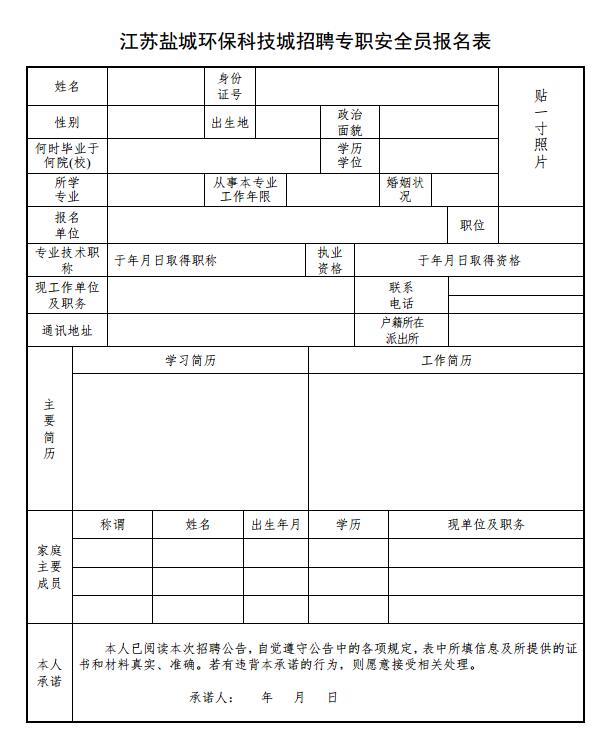 1、报名方式:报名采取现场报名方式。报名者可在江苏盐城环保科技城官网(http://www.ycepstc.com/),下载并填写《江苏盐城环保科技城公开招聘专职安全员报名表》,经现场资格初审后提交。