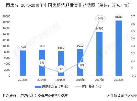 根据废钢协会统计,2018年,全国废钢铁资源总量为2.2亿吨,同比增加2000多万吨,增幅为10%。随着我国钢铁蓄积量的逐年增多,预计2019年我国废钢产生量将会继续提升,但增速或有放缓,废钢产生量将在2.4亿吨左右。另外,2013-2017年中国废钢消耗逐年增长。2017年中国废钢消耗量为14790万吨,较上年同比增长64%。2019年1月,中国废钢协会初步统计,2018年中国废钢消耗总量达到1.87亿吨。可见我国废钢铁的利用程度逐年加深,在一定程度上减少铁矿资源的开发利用,由此看来,发展再生资源行业对我自然资源的保护起到了积极的作用。